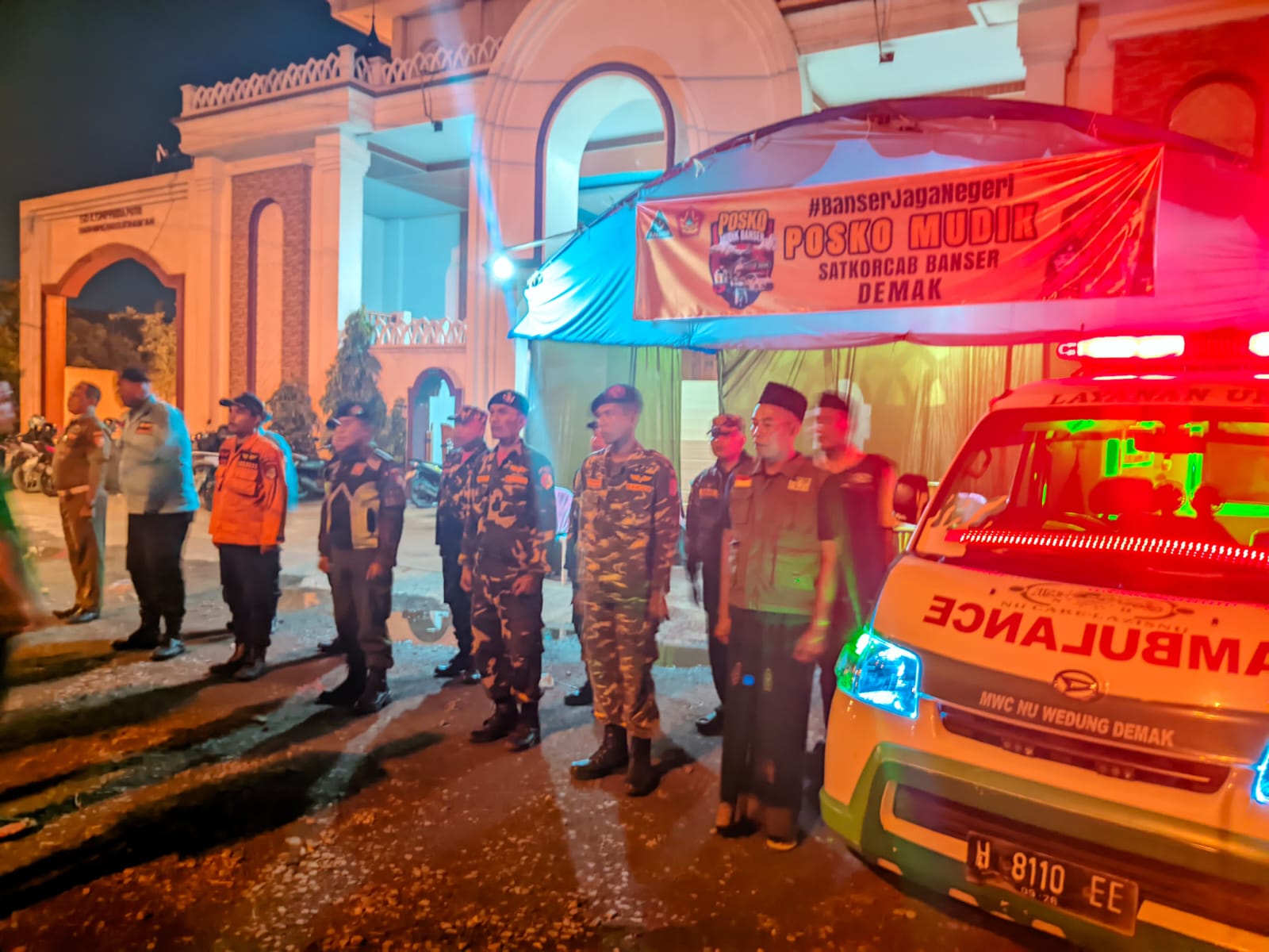 Giat Posko Mudik PC GP ANSOR Kabupaten Demak di jalan Lingkar Semarang Demak depan Ponpes Tahfidz Yayasan KH.Marwan 4M79+CQ Mranak, Kabupaten Demak, Jawa Tengah