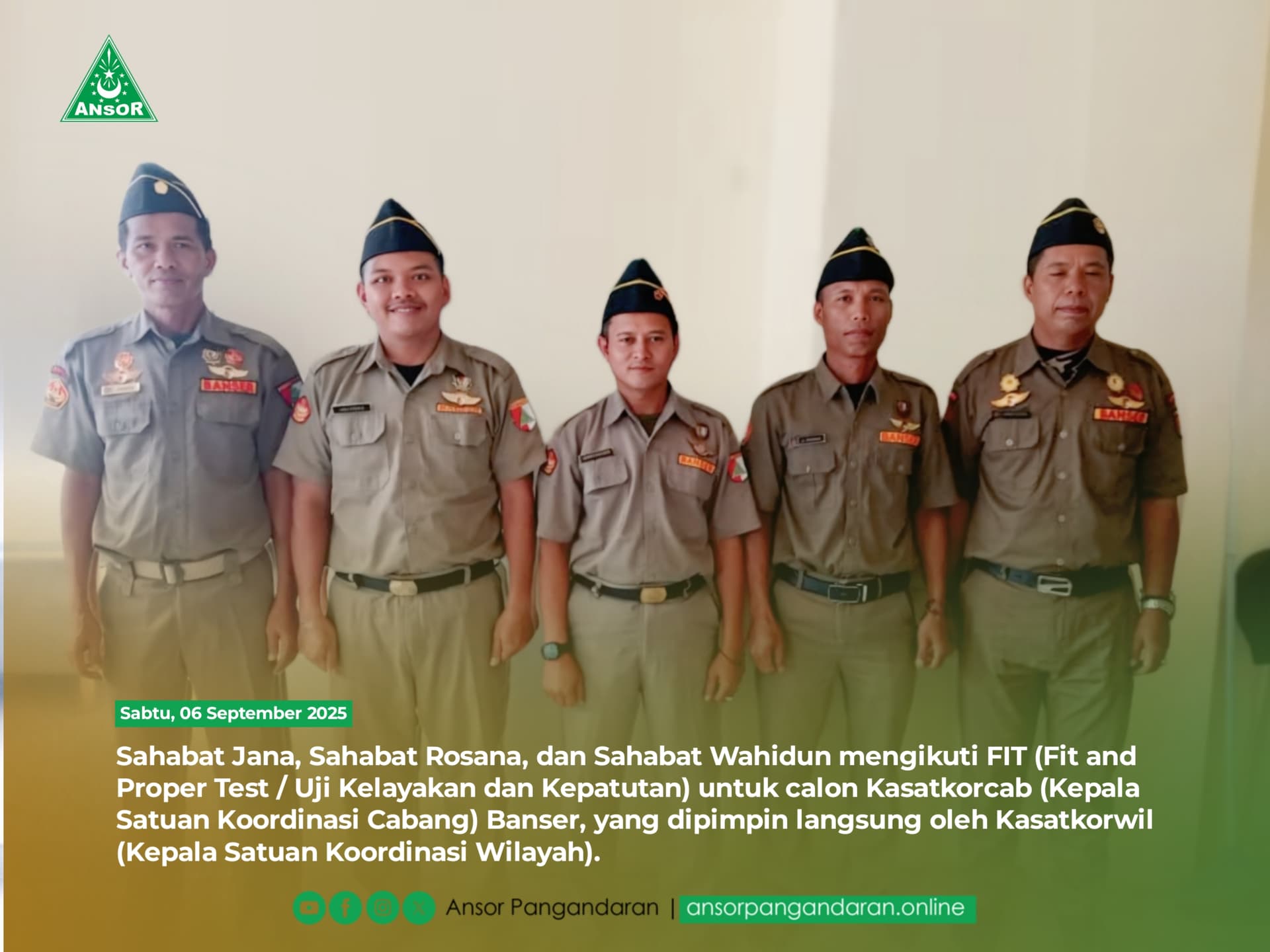 Sahabat Jana, Sahabat Rosana, dan Sahabat Wahidun mengikuti FIT (Fit and Proper Test / Uji Kelayakan dan Kepatutan) untuk calon Kasatkorcab (Kepala Satuan Koordinasi Cabang) Banser, yang dipimpin langsung oleh Kasatkorwil (Kepala Satuan Koordinasi Wilayah